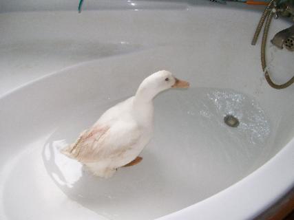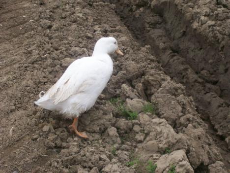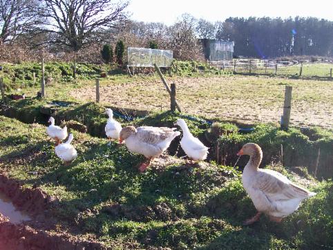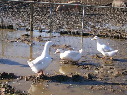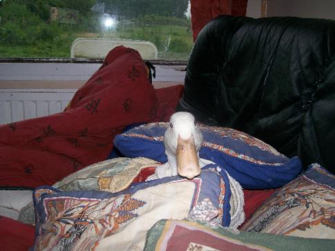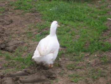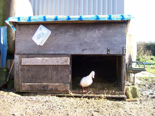 Well he certainly likes to live dangerously! Samantha was walking down to the barn to close the feeders off one afternoon and saw the fox down the bottom of the farm so went back to the yard to get her terrier Crystal in order to chase it off. As she was walking back down to the barn the fox had headed out into the field where Stumpy and all his girls were. The next minute the fox made a mad dash for the group and grabbed Stumpy and ran for the fenceline. Crystal then dashed across the field yapping at his heels and fortunately the fox hit the boundary fence and dropped poor Stump before getting under the fence. There was blood all over Sam who was clutching poor Stumpy who couldn't stand and was in severe shock. It was pretty touch and go overnight but we wrapped him up in towels and buried him in the cushions on the sofa where he stayed until the following morning. He eventually was able to stand and so I put him back outside with the girls as they were worrying where he was and were obviously just a little lost without him. They all stayed around the house for quite a few days as poor Stumpy could only walk about 6 steps and then had to "park" himself down for a rest. He has a nice hole in his back but he has pulled through although feeling very sorry for himself. The ducks obviously remember their odeal as now 2 months later they still don't go out into the field and just stay in the yard and around the house so perhaps it was a lesson was learnt.