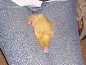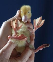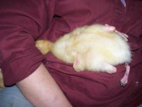 | On Wednesday 7 February 2007 these eggs pipped and were transferred to the hatcher and on Friday 9 February the pippins were finally hatched. At 6.30 a.m., the hatchlings were vent sexed and during this process the most bizarre event was found to have occurred. Stumpy was born! |